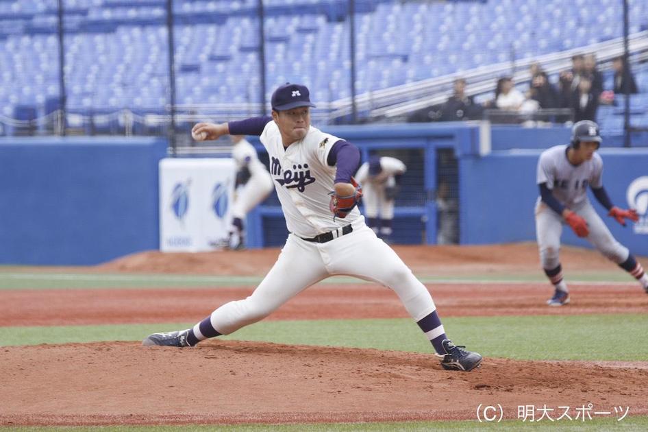 悪い流れを断ち切ることができなかった。明大は初回に本塁打を打たれ、2点を先制される。その裏に添田真海内野手(法4=作新学院)の適時打で1点を返すも、5回表に暴投と犠飛でさらに2点…