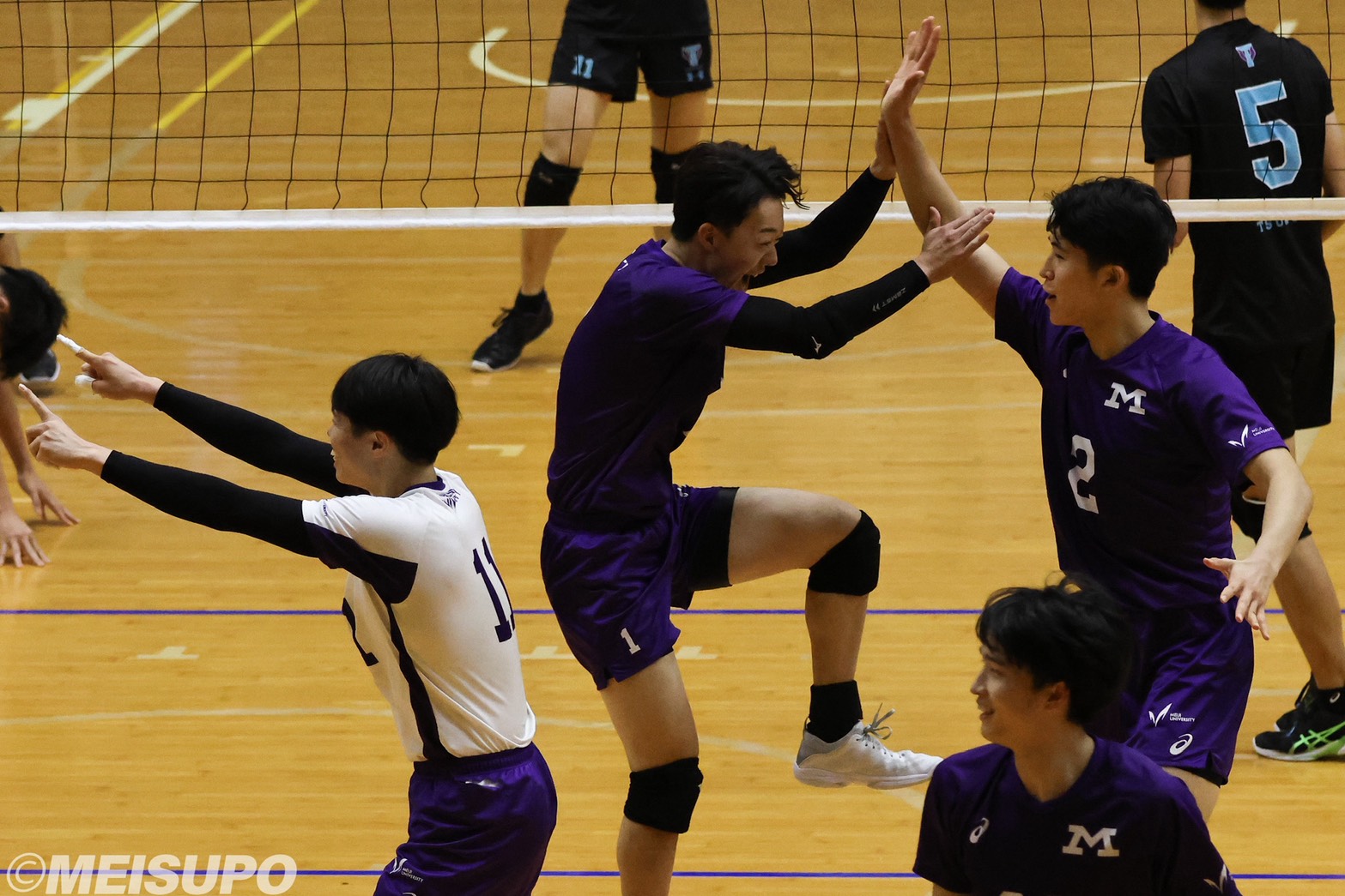 第2セットの滑り出し、加藤のスパイクが決まると、続いて相手の攻撃を2枚ブロックで止め切り得点。一気に5点を先取する。続いて高さとパワーを併せ持つ川村が強烈なクロススパイクやダイレクトを決め11─8とリードを奪う。その後もサーブで相手のキャッチの乱れを誘い、調子の上がったサイド陣の攻撃を決めるという展開が功を奏し、明大がリードを保ったまま19─25でこのセットを取得した。