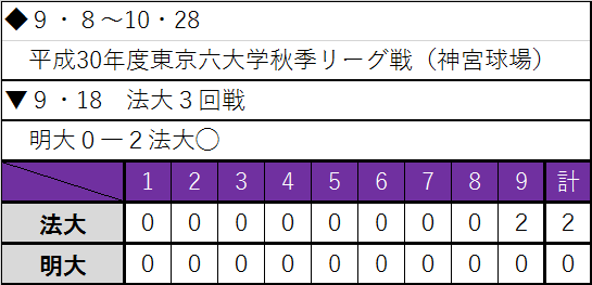 自慢の打線が息を潜めている。昨季は全13試合で73得点、1試合平均では5点を超えるリーグ屈指の打棒を誇った明大。だが今季は3試合を終えここまでわずか5得点。この日も法大のルーキー右腕・三浦銀二を前に勝負どころで1本の出ない拙攻が目立った。「頭を使ってやらないと結果は同じ」(善波監督)。投手陣は最少失点で踏ん張っているだけに、この窮地から優勝戦線へと乗るために打撃陣の復活が求められる。