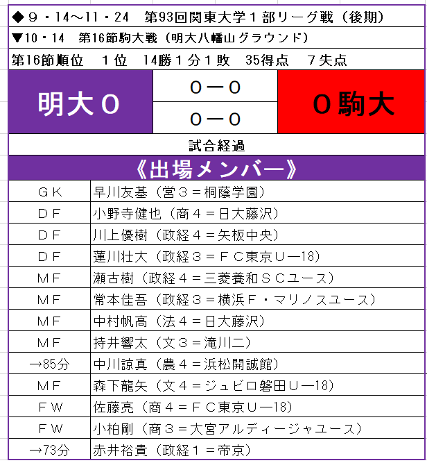台風19号の影響で急きょホーム・八幡山で行われた第16節の駒大戦。優勝へさらに加速させたい明大だったが、序盤から悪天候、そして相手の固い守備に苦しむ。シュート数で相手を上回るがチャンスをモノにできず、悔しい引き分けとなった。