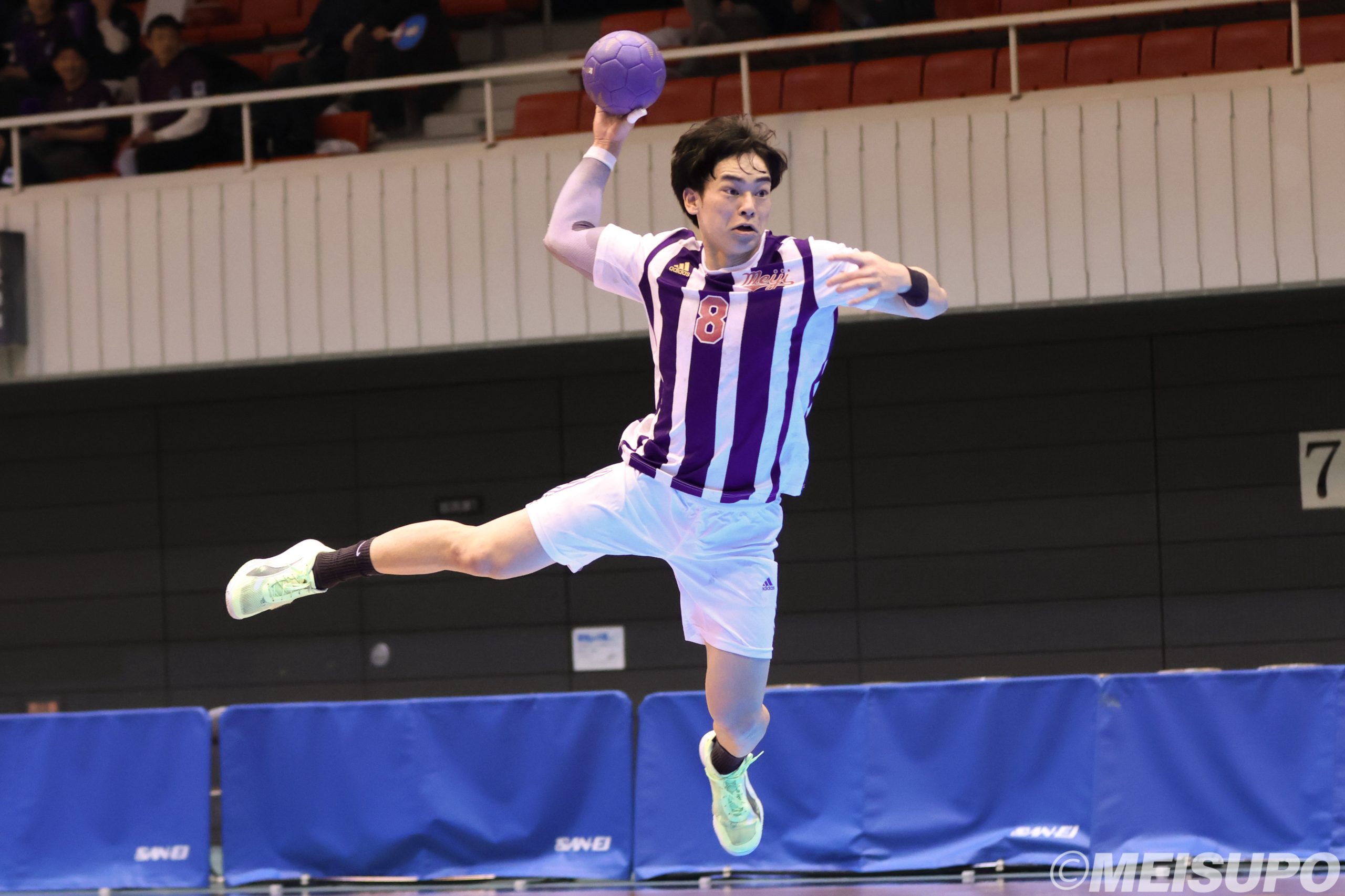 明大の3連勝がかかる中で迎えた相手は春季リーグ王者、筑波大。昨年度の全日本学生選手権(以下、インカレ)、今年度の春季リーグともに敗れた因縁の相手との一戦に「ここで勝ってインカレに向けて弾みをつけたい」(衣川敦人・理工4=旭丘)と強い気持ちで臨んだ。しかし、筑波大が序盤から容赦なく襲いかかる。前半を通して三つの3連続得点を奪われ、着実に点差を広げられる。攻撃面でも放ったシュートが次々と相手のディフェンスやキーパーの好セーブに阻まれた。流れを自分たちのものにすることができないまま前半を5点差で折り返す苦しい展開に。