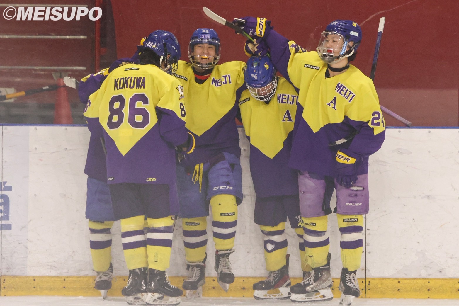 3対3で行われる、5分間のサドンデスに優勝の行方は委ねられた。延長戦序盤から東洋大がパックを支配し、緊迫した場面が続く。中盤、真ん中から駆け上がってきた相手に鋭いシュートを打ち込まれ、その瞬間東洋大が歓喜に沸いた。ここで試合終了と思われたが、ビデオ判定の結果ノーゴールに。そして残り1分。フェイスオフで明大がパックを奪うと、最後のチャンスをうかがう。東洋大の選手チェンジのスキにDF竹谷莉央人(営3=白樺学園)がアタッキングゾーンに駆け出すと、FW丸山詳真(文3=北海道清水)からパスがつながった。「体が勝手に動いた」(竹谷)。相手をかわし、中に切り込むとゴール。延長戦残り29秒。4年ぶりのインカレ優勝をもたらす決勝弾に、今度は正真正銘、明大が歓喜に沸いた。