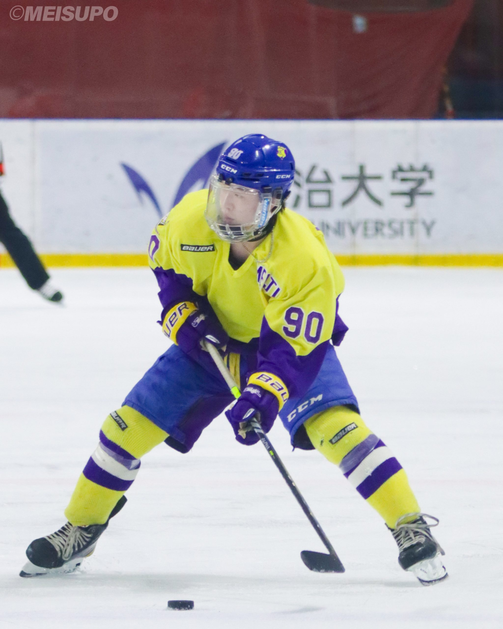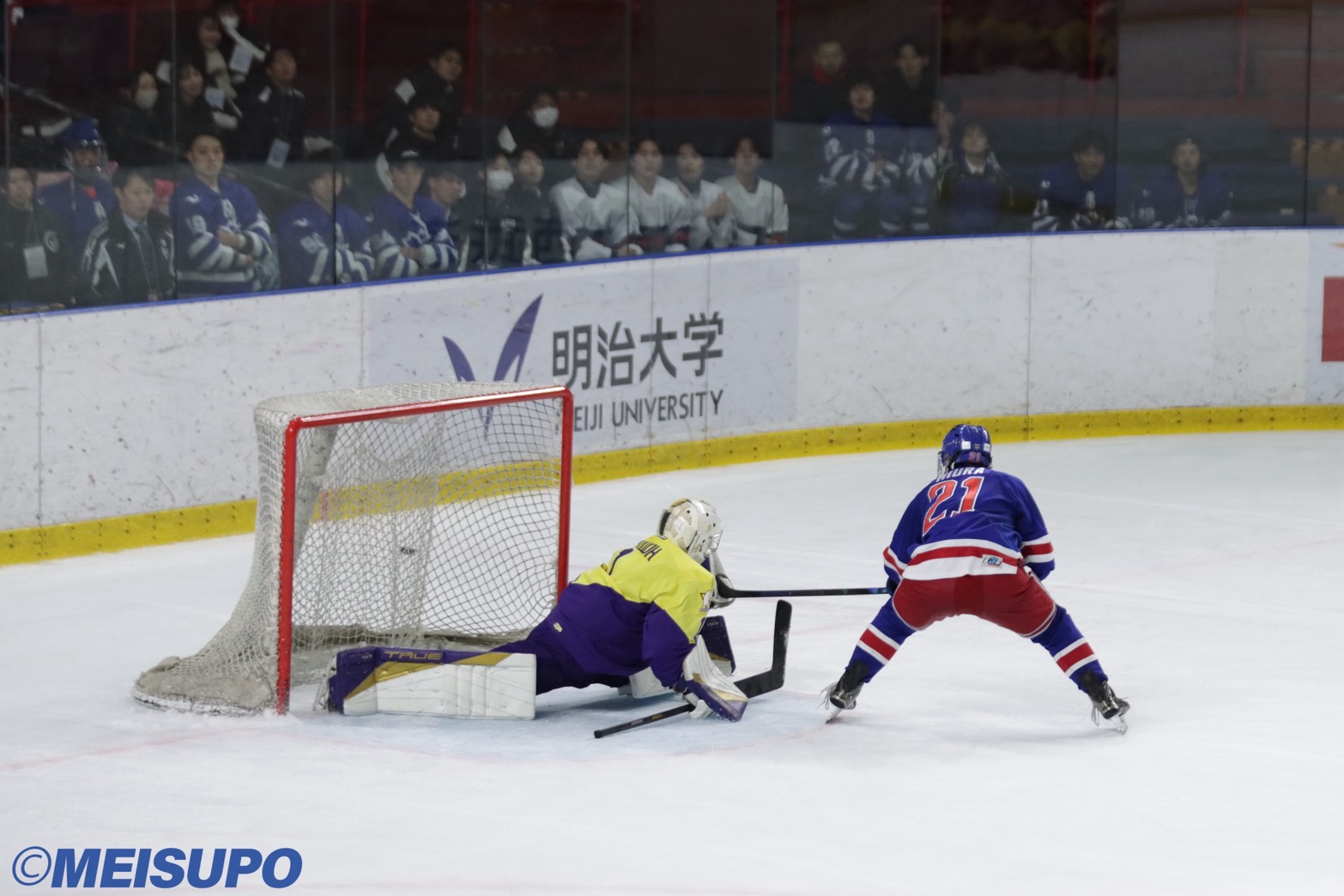 「今日は第1Pが勝負だった」(中村直樹監督)。今シーズン東洋大に負けた試合では第1Pに大量失点、または連続失点をすることが多かった。そのため今試合のプランはロースコアでの試合展開。序盤からパック支配率、シュート数では東洋大がやや優勢も、GK中村柊志綺(政経3=北海道清水)の好セーブでプラン通り、点を決めさせない。「ずっと気の抜けない状態で体力的にも大変だった」(中村)。我慢の時間が続くが、何度も打ち込まれるシュートにも冷静に対応し、第2Pまで無失点で抑えた。