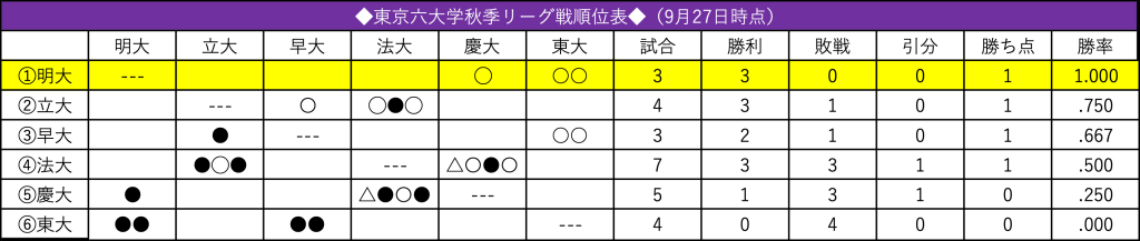 東京六大学野球秋季リーグ戦第3週は春季リーグ戦で死闘を演じた慶大と対戦。3回表に小島大河捕手(政経4=東海大相模)の犠飛で先制する。5回裏に追いつかれるも7回表に瀨千皓外野手(営4=天理)の本塁打で勝ち越し、さらに8回表の2者連続本塁打で突き放す。投げては毛利海大投手(情コミ4=福岡大大濠)が6回1失点と試合をつくった。投打がかみ合った明大は慶大に先勝した。