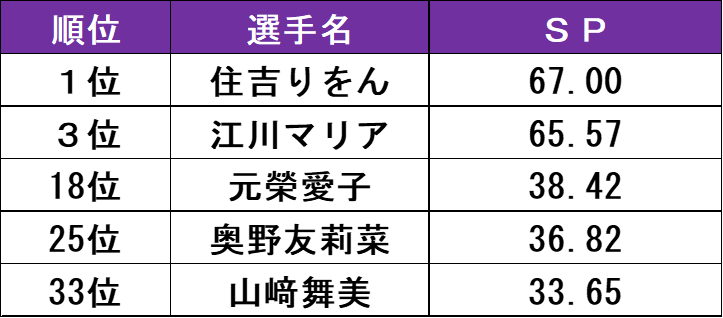 「大会で緊張している時でも、その曲が流れた瞬間に曲が助けてくれるように感じていて」と自身の名前の由来となった特別な曲『アヴェ・マリア』を披露した江川。冒頭のコンビネーションジャンプを成功させると、その後のジャンプも大きなミスなく全て華麗に着氷させた。ステップではレベルを落としたものの、スピンでは全てレベル4を獲得。「今年はあまり試合に対しての結果を求めずにやることで、プレッシャーなくのびのび滑ることができている」。この言葉通り、緊張を感じさせない、曲に合わせた和やかな笑顔と伸びやかなスケーティングで終始観客をプログラムの世界観へと引き込んだ。演技後には観客からスタンディングオベーションが送られた。SPは住吉に次いで3位につけた。FSではさらに上を目指せるか、期待がかかる。