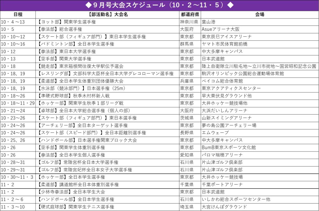 10月2日から11月5日の期間に行われる各体育会部活動の大会スケジュールです。