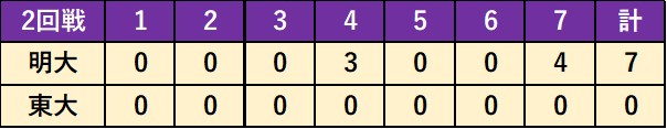 明大は東大との2回戦に臨んだ。序盤から好機を演出するも得点には結びつかなかったが、4回に相手の失策が絡み先制、その後福本真士外野手(営4=明大八王子)の適時打で2点を追加し試合の主導権を握った。7回には5点を追加しコールド。投手陣は佐藤克哉投手(政経4=小山台)、荒川佑太投手(政経4=市立金沢)、夛田圭佑投手(政経4=相模原)、小磯孝平投手(政経4=日大二)の4年生リレーで完封勝利を収めた。