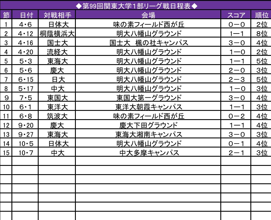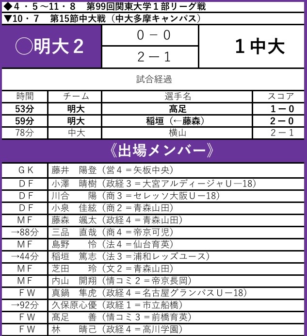 前節の敗戦からわずか中2日空け、中大戦が行われた。前半は両者譲らずスコアレスドローで折り返すが、後半は高足・稲垣が得点を挙げ2―1で勝利。リーグ戦優勝を目指す明大にとって貴重な勝ち点3を獲得した。