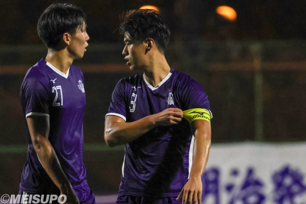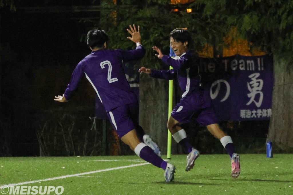 流れを呼び込みたい明大は後半開始直後から積極的に敵陣に攻め込む。53分、高足がセンターサークル付近でパスを受け、得意のドリブルでそのまま前へ。「前が一対一だったので、自分がゴールを決めるという気持ちが強かった」と角度のないところからネットを揺らし、待望の先制点を決める。続く59分には負傷した島野に代わった稲垣がCK(コーナーキック)をヘディングで押し込む。「キャプテンが抜けたことはすごく大きいが、自分がチームを勝たせるという意識をもって入ったのでチームを活気づけられたのは良かった」とチームを勢いづける2点目を奪取。その後もチャンスを演出した明大だったが、「一瞬気が緩んでしまっていた」(池上寿之監督)と逆にわずかなスキから終盤に1点を許してしまう。しかし最後は守り切り、2―1で勝利をつかんだ。