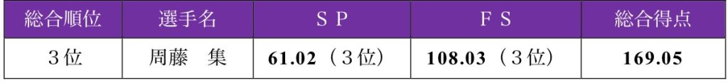 大会最終日の21日には以前から課題としているFSに臨んだ周藤。しっとりとした滑りで『ノートルダムの鐘』の世界観を丁寧に表現した。冒頭のトリプルアクセルはパンクしシングルアクセルとなってしまう。続く2本目のトリプルアクセルでも回転不足を取られ、序盤から思うように得点が伸ばせず。「何一つうまくいかなかった」と、積み重ねてきた練習の成果を出し切れなかった。それでも、気持ちを切らさすことなく後半に向けて立て直しを図る。「途中で崩れそうになった時はまず落ち着くことを意識する」という言葉通り、続くコンビネーションジャンプをしっかりと着氷。3回転ルッツでもわずかな加点を得るなど、諦めない演技を見せた。TES(技術点)は50.31と決して満足のいくスコアではなかったものの、PCS(演技構成点)では特にスケーティングスキルにおいて高評価を獲得。全体を通しての演技の完成度や滑りの質が評価され、3位で表彰台に立った。