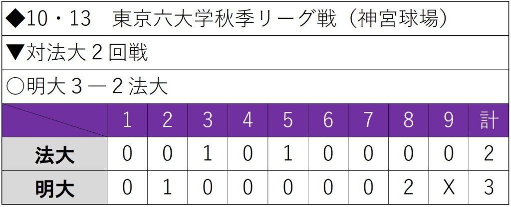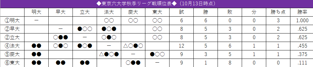 今試合の勝利により法大から勝ち点を獲得した明大はここまで無傷の6連勝とリーグ首位を独走している。次週の相手は春季リーグに目の前で優勝を許した早大。この勢いのまま立ち向かって勝ち点を獲得し優勝へ大きく前進したいところだ。