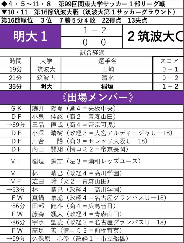 主将・島野を欠く中、アウェーの地で迎えた筑波大との一戦。前半に2点を取られた後、稲垣が得点を挙げたものの、その後はゴールが遠く優勝を目指す明大にとって重い敗戦となった。