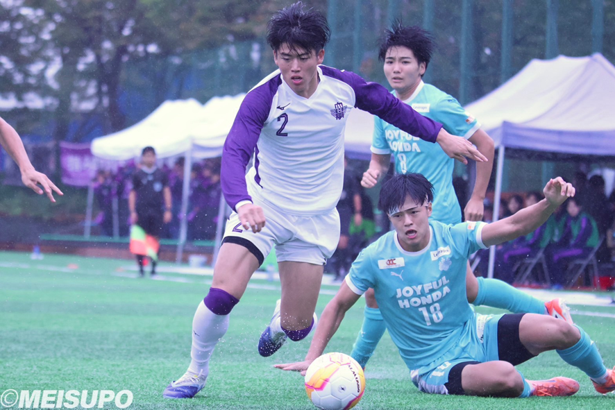 雨の中迎えた最大のライバル筑波大との一戦は序盤から明大ペースで試合が進む。しかし19分にFK(フリーキック)のこぼれ球を押し込まれ先制点を許す。切り替えたい明大であったが2分後にも守備陣の乱れから追加点を許した。怪我で欠場の主将・島野に代わりキャプテンマークを任せられた小澤は「1失点した時にもっと声かけて締めるべきだった」と振り返る。何とか取り返したい明大は36分、パスを受けた稲垣が体勢を崩しながら振りぬいたシュートはゴールネット右隅を突き刺し、重苦しい雰囲気を断ち切るゴールを決め1―2で前半を終えた。「相手を抜いてからシュートというのはイメージできていたので、そういう部分ではイメージ通りだったと思う」(稲垣)。