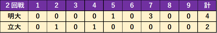 先発・淺田真樹投手(法2=宇部鴻城)は2回裏1死から安打を許す。野手の失策も絡み1死三塁のピンチを背負うと、続く打者への4球目でスクイズを決められ1点を失った。打線は3回表、亘翔大朗捕手(理工3=大分上野丘)の二塁打、淺田の犠打で1死三塁の好機を迎えるも、スクイズを失敗し無得点。「序盤は守備も攻撃も流れが本当に悪かった」(吉武)。4回表にも同様の好機で得点にいたらず、直後に1点を追加されるなど劣勢の状況が続いた。