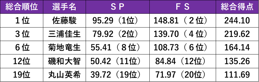 大会最終日は男子FS(フリースケーティング)が実施された。佐藤駿(商4=埼玉栄)FSでは2位にとどまったものの、前日のSP(ショートプログラム)で築いたリードを生かし、総合優勝を果たした。一方、三浦佳生(政経2=目黒日大)はジャンプの乱れ、思うように得点を伸ばせず、総合3位という結果に終わった。