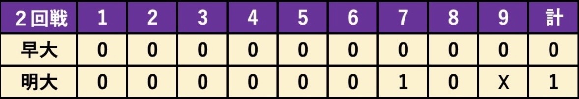 早大1戦目を落としたことにより後の無い明大であったが、打者だけでなく投手の活躍もあり見事勝利を収めた。これにより明日行われる早大3回戦が優勝をかけた試合となる。