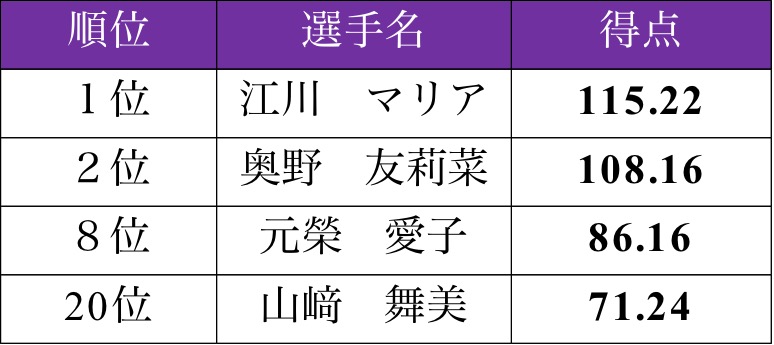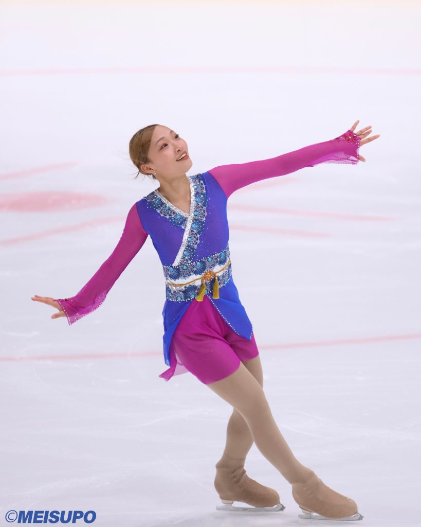元榮愛子(商3=目黒日大)は2本目の3回転ルッツに回転不足を取られるも「最近いい感じに決まっていなかったので、本番ではまあまあいい感じに決められた」と満足感を見せた。1番滑走となったが「意外と練習のまま行けたので、待つよりは緊張せずにいけたのかなと思う」。二つのスピンでレベル4を獲得し、大きなミスなく伸び伸びとしたスケーティングで会場を魅了。見事8位入賞を果たした。