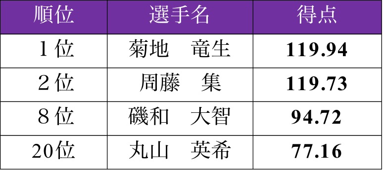辰巳アイスアリーナで東日本学生選手権が開催され、明大は3学年から4人が出場した。菊地竜生(政経3=目黒日大)が男子の最上級生としてチームを引っ張る演技を披露し2位につけたほか、大学入学後初の団体戦となった周藤集(政経1=ID学園)が3位に入賞し、団体では3位で表彰台に入りを果たした。