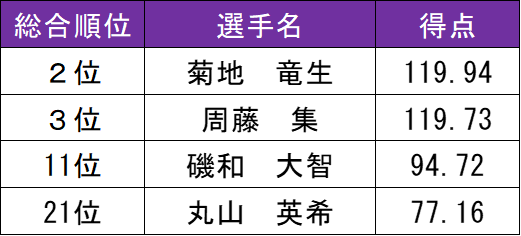 辰巳アイスアリーナで東日本学生選手権が開催され、明大は3学年から4人が出場した。菊地竜生(政経3=目黒日大)が男子の最上級生としてチームを引っ張る演技を披露し2位につけたほか、大学入学後初の団体戦となった周藤集(政経1=ID学園)が3位に入賞し、団体では3位で表彰台に入りを果たした。