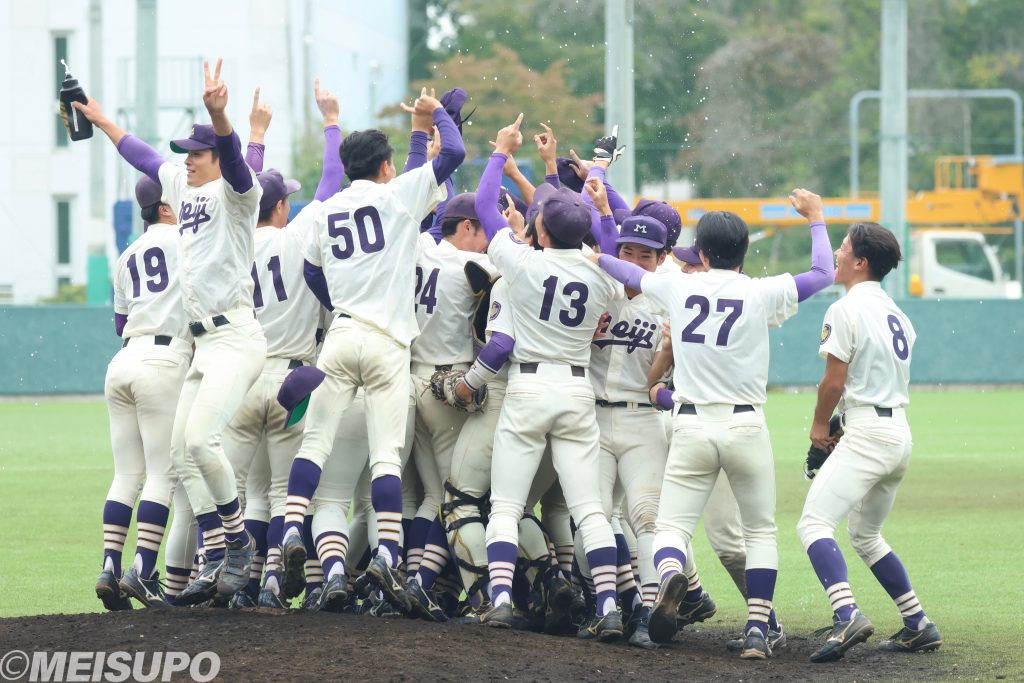 試合は森の好投もあり1―0のまま9回裏へ。抑えれば優勝の場面、マウンドには前日に先発した淺田の姿があった。「気持ちをめちゃくちゃ入れて『今までやってきたから絶対大丈夫』と自分もバックも信じて投げた」。先頭を三振に斬って取ると、続く打者は投ゴロ。その後シフトの逆を突く内野安打こそ許したが、最後は代打を捕邪飛で抑えると、マウンドに続々と集まる選手たち。明大は2014年秋以来となる、11年、21季ぶりのリーグ戦優勝を果たした。