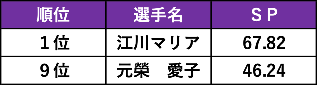 昨年の東日本王者の江川は名前の由来となった『アヴェ・マリア』を披露した。伸びやかなスケーティングで世界観をつくり、終始笑顔で滑り切った。冒頭のコンビネーションジャンプを成功させると、3回転ルッツ、2回転アクセルも難なく成功。スピン、ステップともにレベル4を獲得する見事な演技を見せ「今回は一つ一つどれをとっても取りこぼしのない出来栄えの良い演技を目指してやってきたので、しっかりとそれを出せた」と演技終了後にはガッツポーズ。今季自己最高の67.82点で首位となった。「今大会はSPとFS(フリースケーティング)どちらもそろえるということを一番目標に練習してきたので、しっかりフリーも落ち着いてできたら」と2年連続の優勝へ明日のFSに挑む。