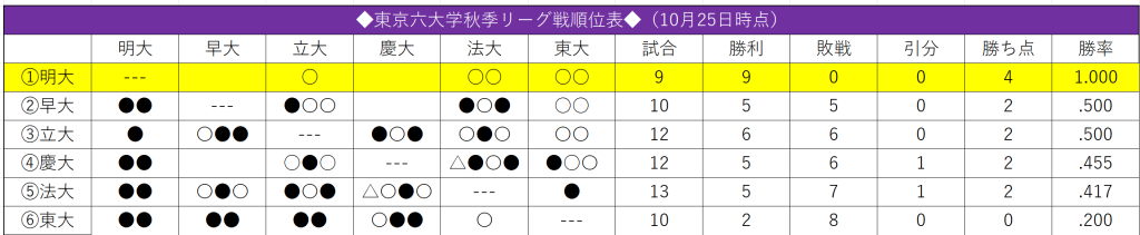今試合の勝利により、次の試合で勝利すると明大にとって1996年秋以来29年ぶりの全勝でのリーグ優勝が決まる。神宮大会へ弾みをつけるためにも必ず勝利を収めたいところだ。