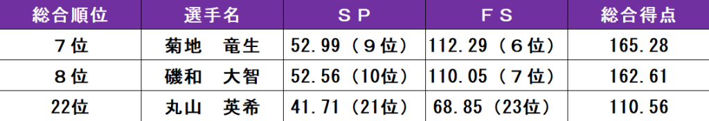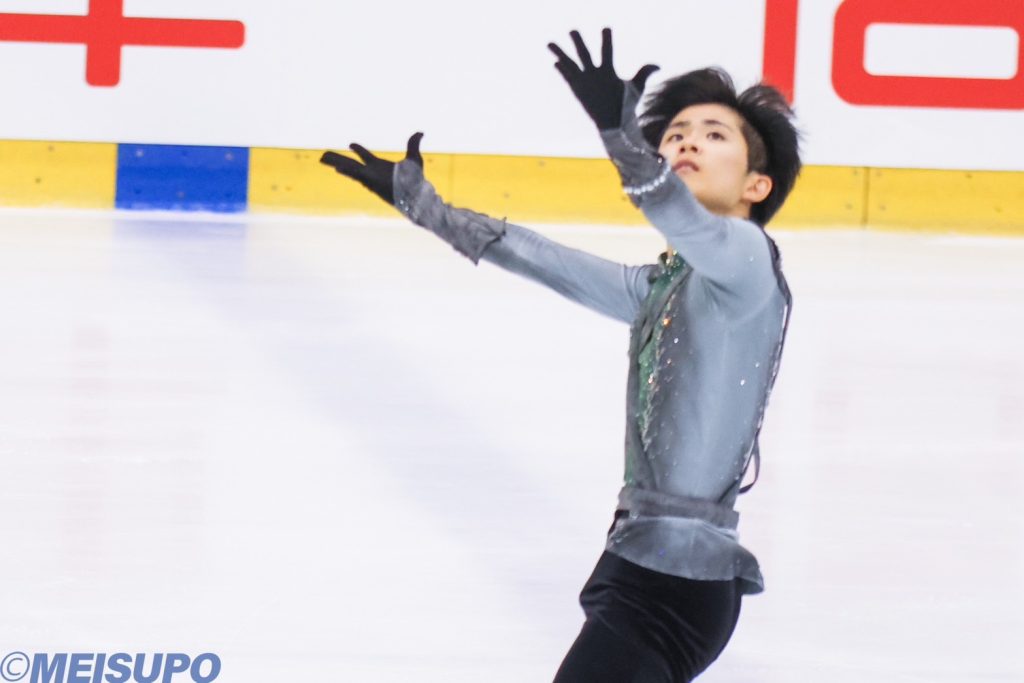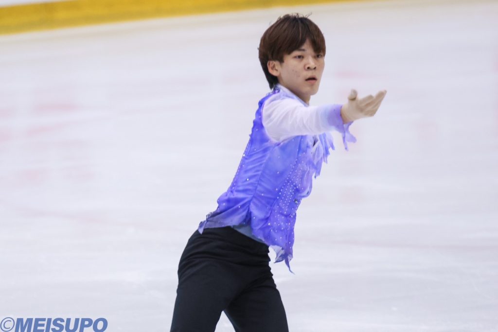 シニア男子FSには、丸山英希(法2=宇都宮短大付)、磯和大智(営1=京都両洋)、菊地の3選手が出場。まず初めに登場した丸山は、大会前から構成に入れたいと語っていた3回転ルッツから演技が始まった。しかし惜しくも転倒し成功とはならない。手足を大きく使った振りや緻密なステップシークエンスを見せたが「シーズン通してコンビネーションでミスをすることが多い」と3本のコンビネーションジャンプはいずれもGOE(出来栄え点)で減点となり、課題が残った。