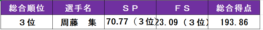 大会最終日は、ジュニア男子とシニア男子のFS(フリースケーティング)が行われた。ジュニア男子では2本のトリプルアクセルを決めた周藤集(政経1=ID学園)が3位となり、表彰台に登った。12月の全日本選手権(全日本)出場を懸け5位以内を狙ったシニア男子は、菊地竜生(政経3=目黒日大)が7位で最上位となり惜しくも出場権獲得を逃した。