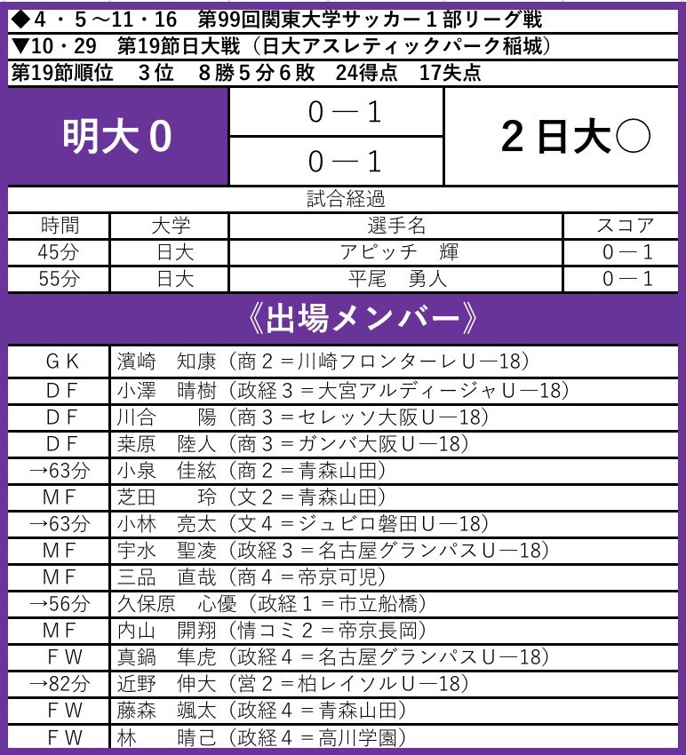後半が始まってもゲームは日大ペースで展開していく。55分にはゴール前1対1の攻防に競り負け、再び失点を許す苦しい展開に。失点後は「パワーのある選手を」(池上寿之監督)と得点を取り返すべく、久保原、小泉、小林、近野を投入し反撃を試みる。しかし「途中交代の選手が流れを変えるという点では、自分のやるべきことはあまりできなかった」(小泉)と劣勢を跳ね返すことができずそのまま0-2で敗れた。
