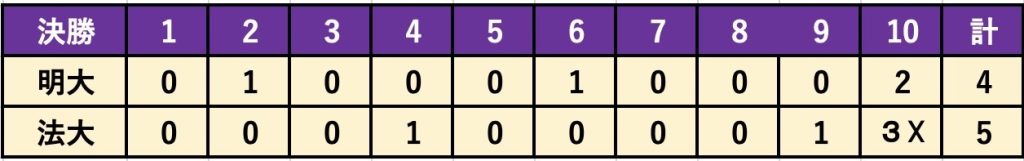 快勝した前日の流れに乗ったまま優勝を果たしたい決勝戦。相手は春の新人戦の王者であり、東京六大学秋季リーグ戦2位の法大。2回と6回に得点を挙げたものの、いずれも追いつかれ、タイブレークの末に押し出しでサヨナラ負けを喫した。要所での失策が痛手となった。