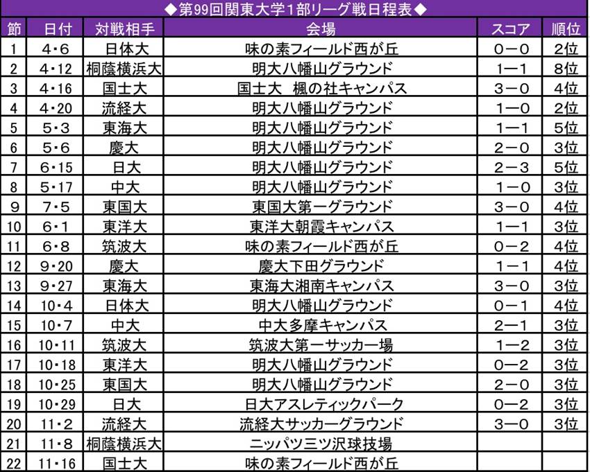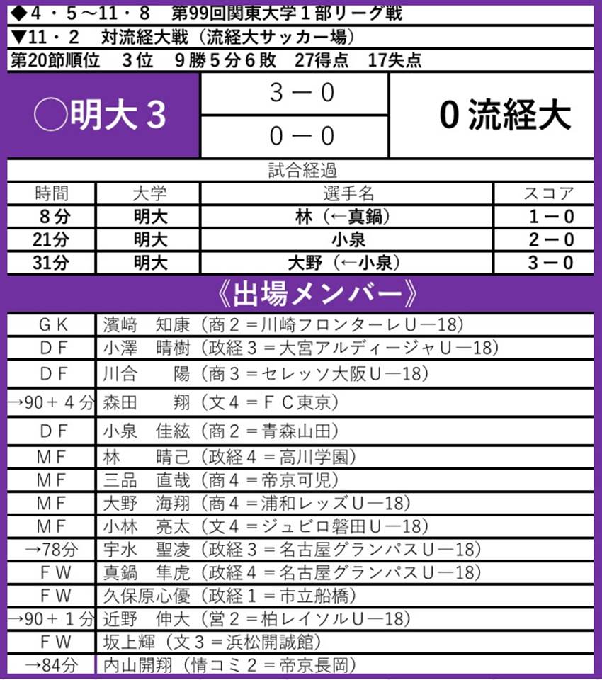 今節はアウェーで流経大とのマッチアップ。前半から明大が立て続けに攻撃を仕掛け3得点。後半は流経大に攻め込まれるもゴールを許さず勝利を収めた。