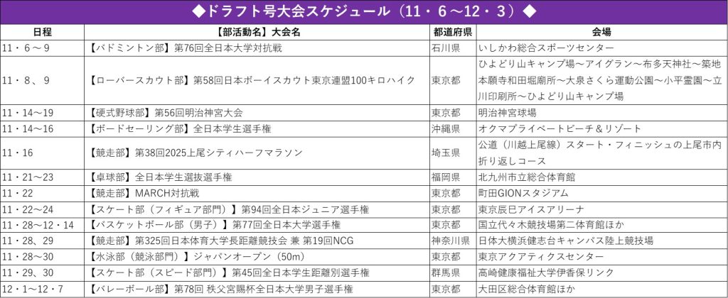 11月6日から12月3日の期間に行われる各体育会部活動の大会スケジュールです。