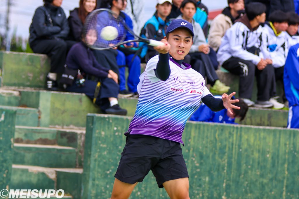 立ち上がりから苦しい戦いとなった。国学院大戦では、風の影響で打球が思うように定まらず、惜敗。後に引けない重要な第2戦の相手は、昇格組・東海大。小宮彰悟(営3=上宮)・木内陸人(営2=上宮)ペアは、木内のボレーや左右に揺さぶる小宮のラリーで緩急あるプレーをするも相手のコースを突いたショットに打ち負かされた。続く上田泰大(商3=尽誠学園)・米川雅翔(農1=尽誠学園)ペアは、米川のネットをかすめる低い打球と上田のボレーが炸裂(さくれつ)。完璧に相手を崩し、勝利した。その後も3勝で勝ち越し、東海大相手に4ー1で勝利を挙げた。最終戦の相手は、難敵・法大。シングルスで出場した坂口生磨(商1=尽誠学園)は、学生No.1の橋場柊一郎(法大)と対決した。坂口は猛者相手にも怯まず、緩急あるバックハンドとキレのあるフォアハンドを多様に使い合わせ、粘り強いプレーを見せたが力及ばず敗れた。岡田侑也(農3=とわの森三愛)・中村悠峰(営3=能登)も1ゲーム先取されてから苦しい展開が続く。しかし、流れを相手に渡さず、岡田の強烈な一打や中村のサーブが光る。持ち味の息のあったプレーで勝利をつかんだ。この勢いのままいきたいところだが間庭賢人(農2=東農大二)・小山寛晴(法1=尽誠学園)ペアも法大の粘り強さに阻まれた。1ー4と難敵の壁が大きく立ちはだかった。この結果、1日目を1勝2敗で終えた。