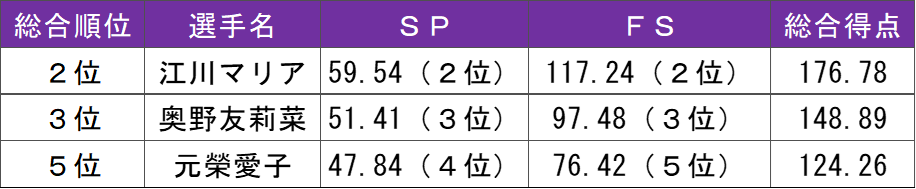 巻き返しを狙うFSでは冒頭の3回転ルッツ+3回転トーループを回転不足があったものの着氷させた。しかしその後のジャンプでは「平常心を保てていなかった」と精彩を欠く結果になってしまう。特に最後の3回転サルコーについては「いつも練習で失敗しないので失敗してしまったことがとても悔しい」と悔しさをにじませた。それでもしなやかな体づかいで曲を演じ切り、3位入賞。「気持ち的に楽ではない状態で3回転+3回転を決めることができたというのは大きな収穫」と大会を振り返った。2025年は「夏にとてもいい成績を残せていたのに、シーズン本番になって出せなかった」年となった奥野。この悔しさを力に変え、来年はさらに成長した姿を見せてほしい。
