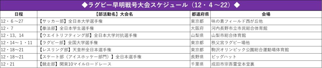 12月3日から22日の期間に行われる各体育会部活動の大会スケジュールです。