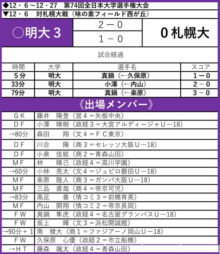 明大は後半からノレファ山口FC内定の藤森を投入し、さらに勢いに乗りたいところだったが思うようにボールがつながらず、守備の時間が続いた。「相手にペース握られてピンチになってもおかしくないシーンを作ってしまったので、そこは次に向けての反省」(藤井)。その中79分に右サイドからカットインした真鍋が左足を振り抜きゴラッソ。このプレーについて池上寿之監督は「個人のスキルを生かした素晴らしいシュートだった」と称えた。このゴールで流れを引き戻した明大はその後、相手の反撃を許さず、3-0で試合を終えた。