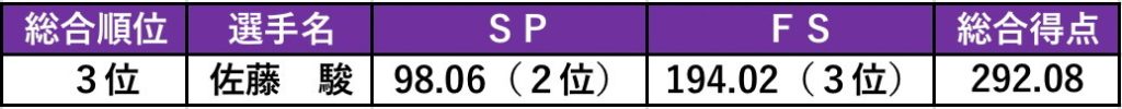 「最後まで高く飛ぶ『火の鳥』を見てほしい」。入場時のビジョンに映し出されたコメントでそう意気込んだ佐藤が、会心の演技で大観衆を沸かせた。前滑走者のイリア・マリニン(アメリカ)が6種7本の4回転ジャンプを成功させ会場をどよめかせた直後の演技。総合332.29点を耳にしたものの「緊張を力に変えることができた」と動じる様子は見せず。演技前に頬を両手で軽くたたき、鋭い眼差しを見せた佐藤は圧巻のジャンプで空気を一変させる。冒頭の4回転ルッツはGOE(出来栄え点)2.14を記録すると、続くコンビネーションジャンプ、4回転ー3回転のトーループでも2点台を連発。「ルッツが決まった後からすごく落ち着いてできた。プログラム全体としても、ジャンプ以外の部分もいつも以上に動けていた」と笑顔で話したように、スピン、ステップでも全てレベル4を獲得した。