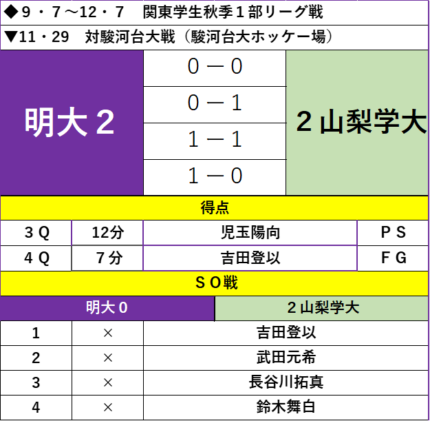第3Qは序盤から拮抗(きっこう)した展開を迎える。「中盤での攻防から速攻を仕掛けたり仕掛けられたりの展開が続きかなり体力的にきつかった」(FB高橋澄世主将・商4=横田)。しかし中盤、山梨学大にPCを許し点差が広がってしまう。それでも第3Q12分、PS(ペナルティーストローク)を獲得し、MF児玉陽向(政経3=横田)が鋭いシュートを決める。第4Qでも、流れに乗り、チャンスをつかむ。第4Q7分には、吉田がキーパーの隙をついてシュートを放ち、同点に追いつく。この勢いのまま連続得点を重ねたい明大だったが、吉田のPCは、ゴールからわずかに上に外れる。しかし、キーパーの活躍により、2度のPCを止め、SO戦にもつれこんだ。1回目は両者ともに外す。2、3回目も、明大は外してしまうが、山梨学大は2得点を挙げる。後がない4人目もゴールを決めることができず、SO戦は0―2という結果で、今年度最後の公式戦は黒星となった。