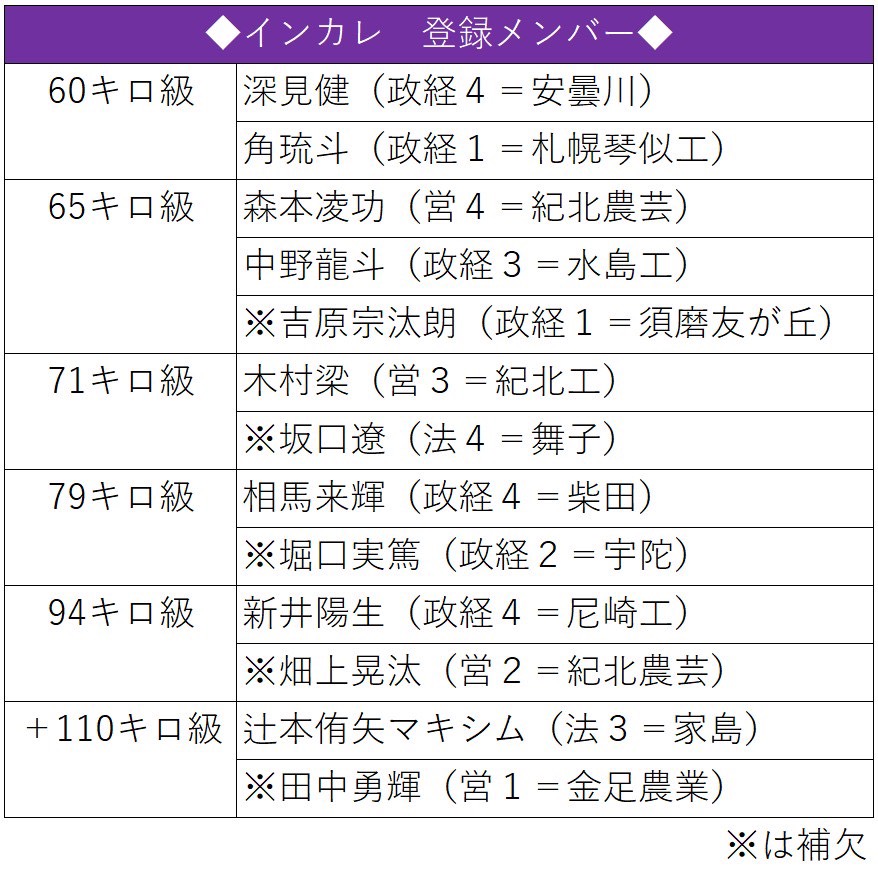 深見「同期のインカレに出場する3人が楽しみです。森本と相馬(来輝・政経4=柴田)は階級変更もあり、いつもより上の階級で戦って、新井(陽生主将・政経4=尼崎工)は減量ですが、今一番調子がいいので、最後の試合でいい姿を見られたらなと思っています」