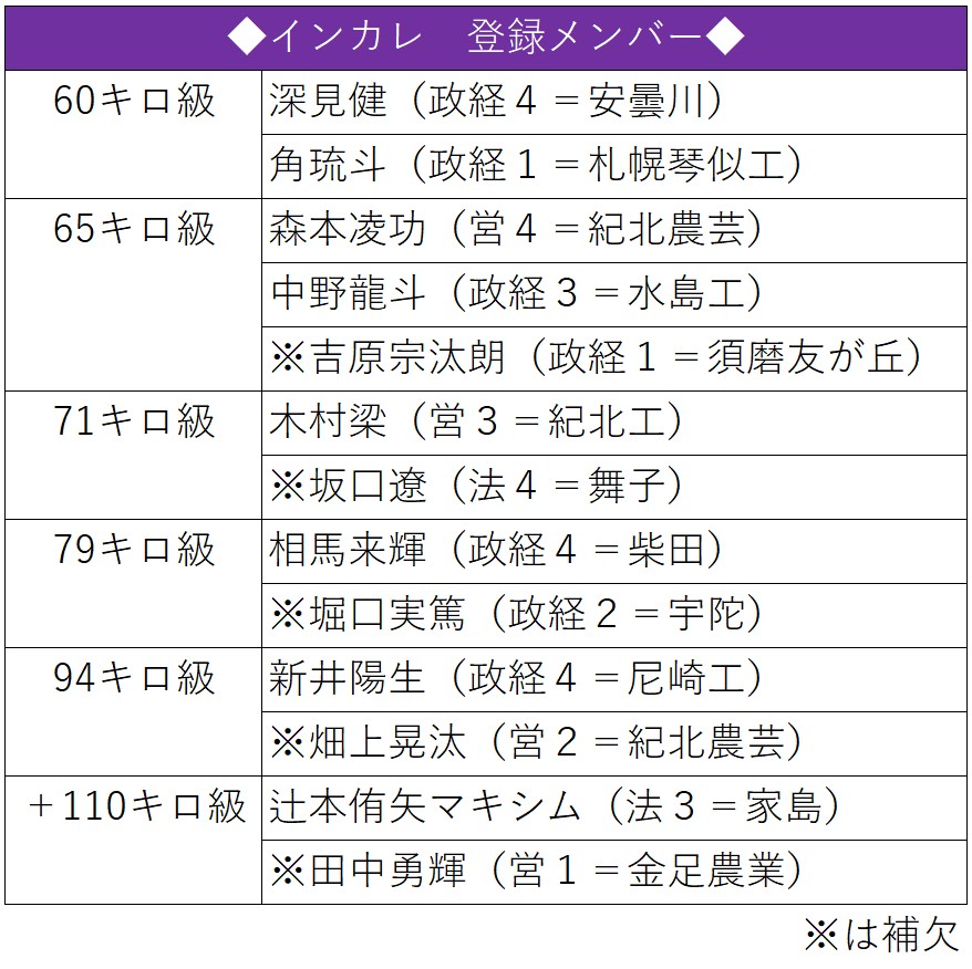 1年の集大成となる大会がいよいよ始まる。12月12~14日に山梨市総合体育館にて全日本大学対抗選手権(インカレ)が開催。夏の東日本大学対抗選手権(東インカレ)では、団体6位と表彰台には届かなかった。目標の5位入賞へチーム一丸となって全国の猛者たちに挑む。