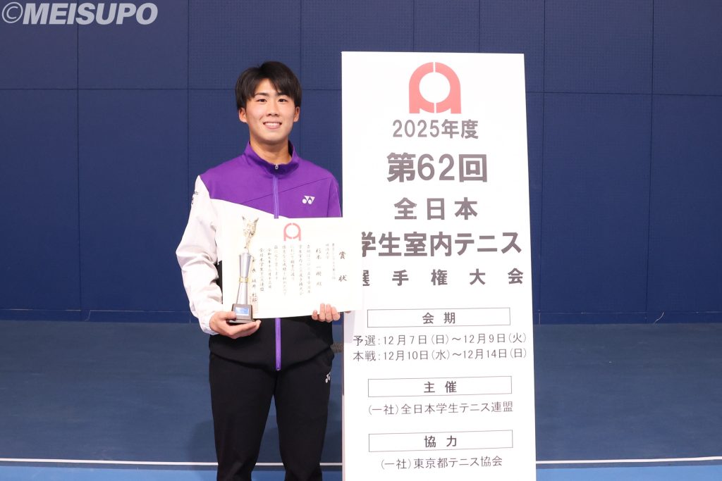 全日本学生室内選手権(インカレインドア)4日目には準決勝が行われた。単複準決勝へと駒を進めた杉本一樹(営1=湘南工科大付)は、関東学生選手権(夏関)で敗れた髙妻蘭丸(筑波大)に敗北を喫するも、ダブルスでは水野惺矢(政経2=四日市工)とともに髙妻蘭丸・山本律組(筑波大)を撃破。見事に決勝進出を決めた。