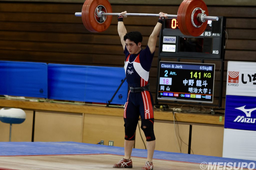 今年度、出場した大会で3本のスナッチを全て成功させてきた中野。今大会でも1、2本目では安定した試技を披露したが、3本目の128キロはバーベルを前に落とし挙上し切れず「最後の最後でミスしたのが自分の中で一番悔しい」と振り返った。切り替えて挑んだジャークでも2本目までは危なげなく挙上。3本目は自己ベストを超える146キロに挑んだが、クリーンできずトータルで3位に。「この1年間で2位の小林光星選手(法大)に毎回負けていて、しかもスナッチは勝ってジャークで逆転されるのが恒例なので、この恒例を次の大会までにはなくしたい」と来年度への決意を語った。