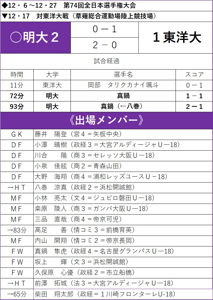 ここまで無失点で勝利してきた明大。勝てば首位での突破が決まる最終節は東洋大との一戦に。前半セットプレーから失点を許すも真鍋が2得点で逆転勝利を飾った。