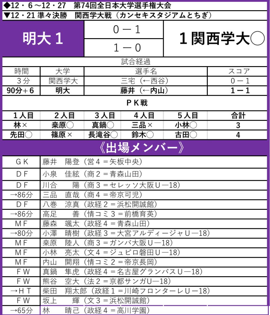 その後試合は延長となったが30分間で両チームとも得点を決めることはできず。「チームが悔いのないように」(小林)。試合はPK戦へと突入した。両チーム3人目までを終えて2-2。続く4人目は明大が外し関西学大は成功となる。先攻の明大は5人目が決め望みをつないだが、選手たちの祈りは届かず3-4で敗れた。