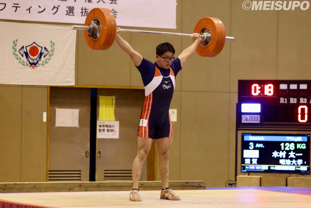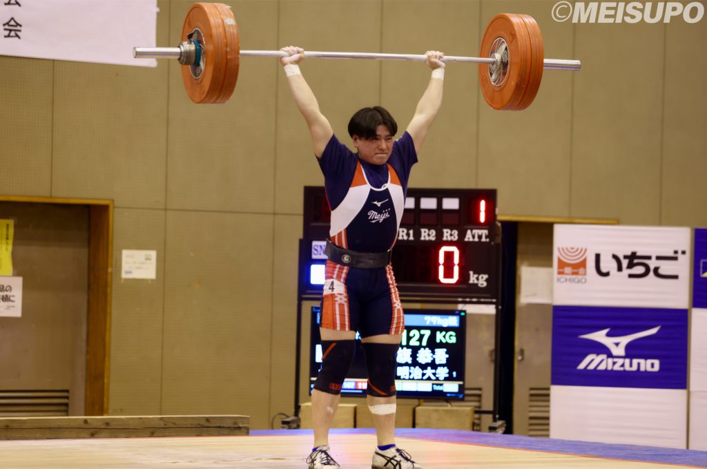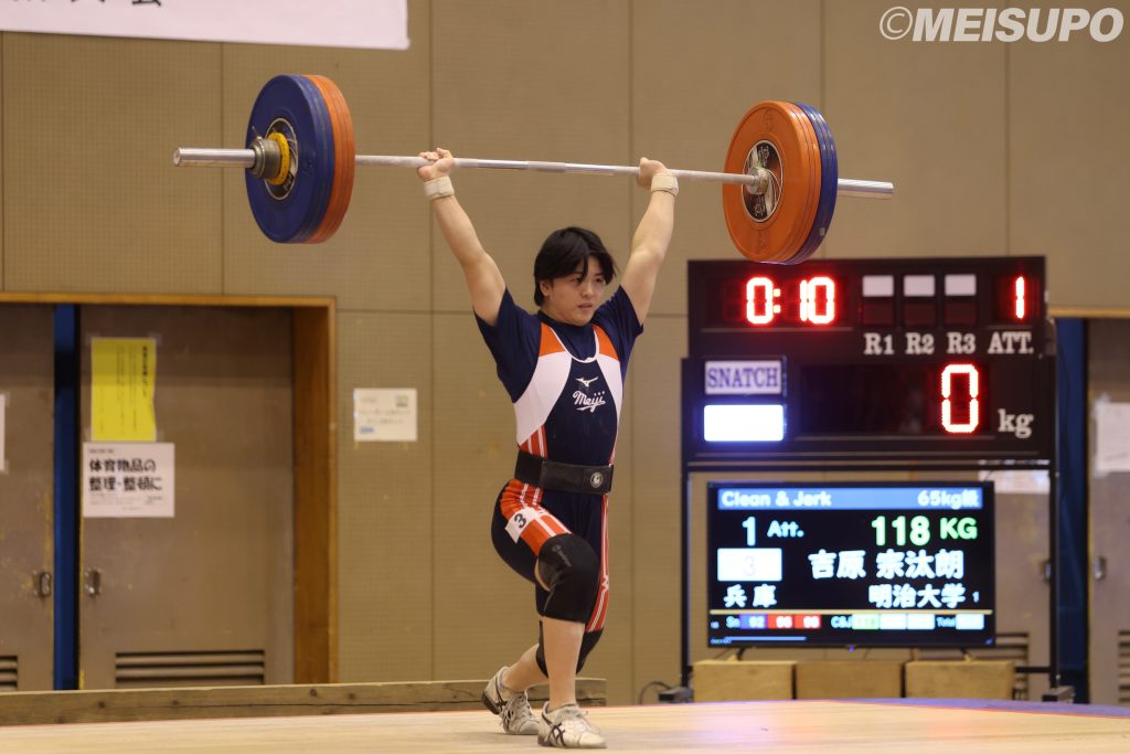 明大として1番にプラットフォームに上がった角はスナッチの1本目を落としてしまうも「普段なら失格がよぎってしまうが、絶対取れると思って臨むことができた」とそこから2、3本目を連続で拳上する。ジャークでは3本目こそ失敗するも125キロを挙げ、スナッチ、ジャークの両方で1位となり文句なしの優勝を果たした。続く65キロ級に出場した吉原宗汰朗(政経1=須磨友ヶ丘)はスナッチでは92キロを拳上。ジャークでは「立った時に重心が崩れた」と3本目の126キロを落とし、5位という結果に終わった。「全国から強い選手が集まっていて、このままではいけないなと思った。最終的にはインカレで表彰台に乗れる選手になりたい」と課題が明確になった大会となった。