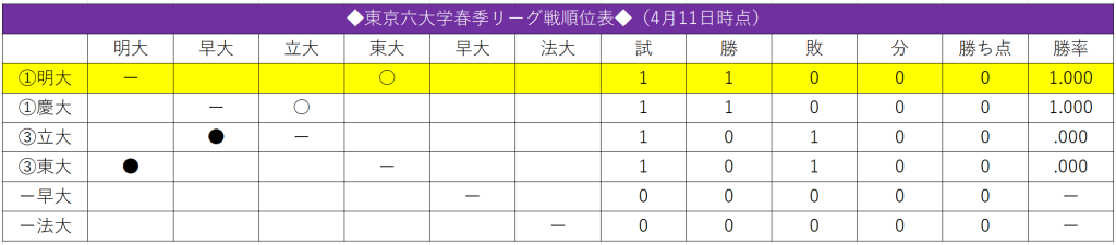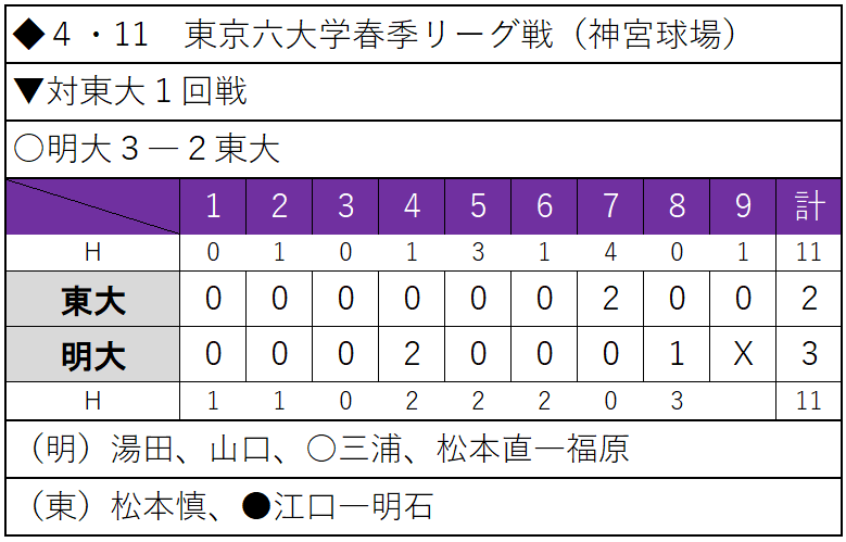 連打はあったものの、長打と適時打なしで3点を取った明大。翌日の試合もつなぐ野球で東大を振り切り、連勝で勝ち点獲得となるか。
