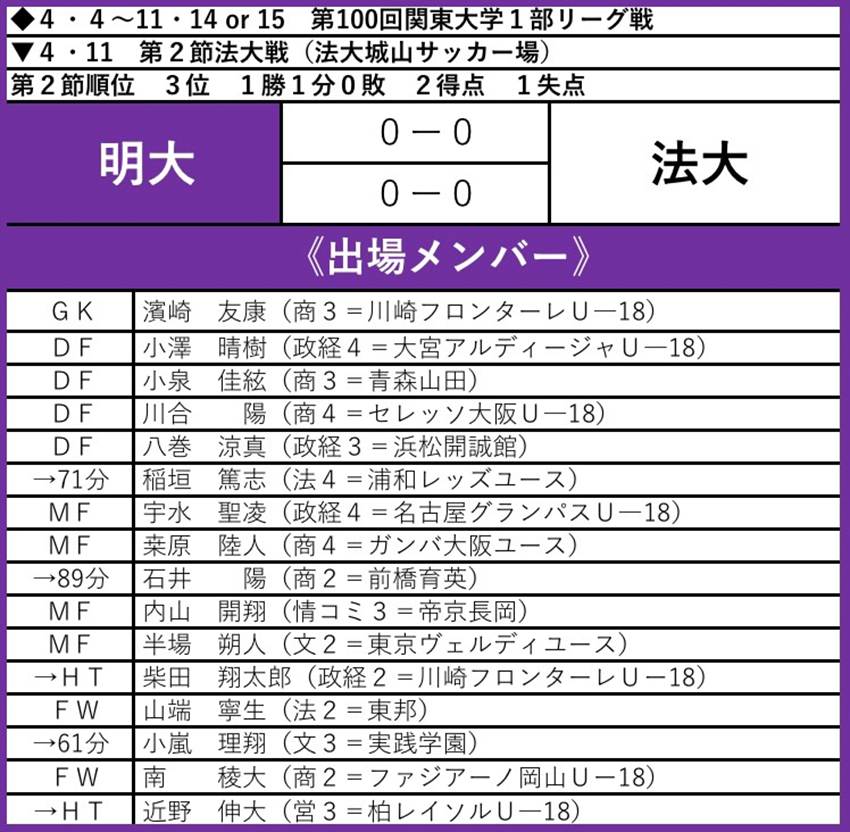 リーグ戦連勝を目指す2戦目は法大との対戦となった。前半から一進一退の攻防を繰り広げたが、両者ともにゴールが遠く、試合はスコアレスドローで幕を閉じた。