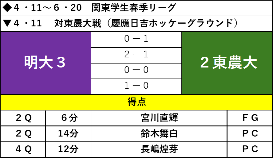 点数が動いた前半に対し、第3Qではお互いに得点チャンスを生かし切ることができず、同点のまま最終Qに突入した。第4Qは開始早々にPCを獲得するも、ここではシュートを入れることができなかった。その後も明大ペースで試合が進むと13分に再びPCを獲得。シュートは東農大のGKのセーブに阻まれてしまうも、PCを連続で得ると長嶋が点を奪い逆転に成功。その後は東農大に反撃を許さず、3-2で試合を終えた。「(東農大は)守ってカウンターから得点を取るチームで、僕らも最初はそれで2点決められたが、そのあとは修正できて、0点に抑えることができた」(小林)。