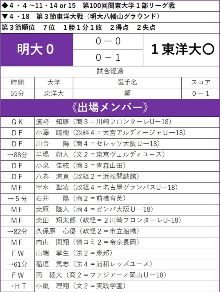 得点が欲しい明大は後半開始と同時に第1節に決勝点を決めた小嵐を投入。50分に小嵐がカットインからシュートを放ち存在感を見せる。52分にはスローインからボールを受けた小泉のクロスに内山が合わせるも相手のブロックに阻まれる。明大は立て続けに好機を演出するも、55分に相手右サイドからのクロスに対応が遅れ失点を許す。その後も東洋大の守備を前に、低い位置でボールを保持する展開が続く。「相手に合わせて、前にチャレンジする回数が少なかった」(池上寿之監督)。AT(アディショナルタイム)には小泉のクロスからフリーの小嵐が頭で合わせるも枠をとらえることはできず。2試合連続無得点で今シーズンのリーグ戦では初の敗北を喫した「後半は相手の枠内シュートは1本だったが、相手はそのワンチャンスを決めてこちらは決めきれないという展開だった。明治が大事にしている三原則(球際・切り替え・運動量)を日頃積み重ねてきたのに試合で出せなかったことが全てだと感じている」(桒原)。