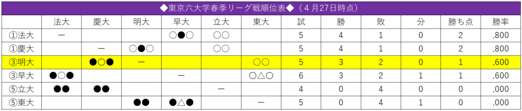 昨年度は不振にあえいだ渡辺和の好投が明大打線を苦しめた。回を重ねるごとに調子を上げる投球で点差を縮めることを許さず、流れは慶大から戻ることはなかった。明大にとっては課題が残る一戦となったが、リーグ戦はまだ序盤。この悔しさを次戦につなげたい。